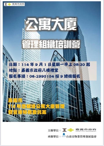114/09/01(星期一)上午八點30分起,地點嘉義市 政府八樓禮堂舉辦嘉義市114年度輔導公寓大廈管理暨宣導勞務委托案辦理🌵114年度嘉義市 管理組織培訓營🌵主辦單位:嘉義市政府協辦單位:台南市物業管理發展協會